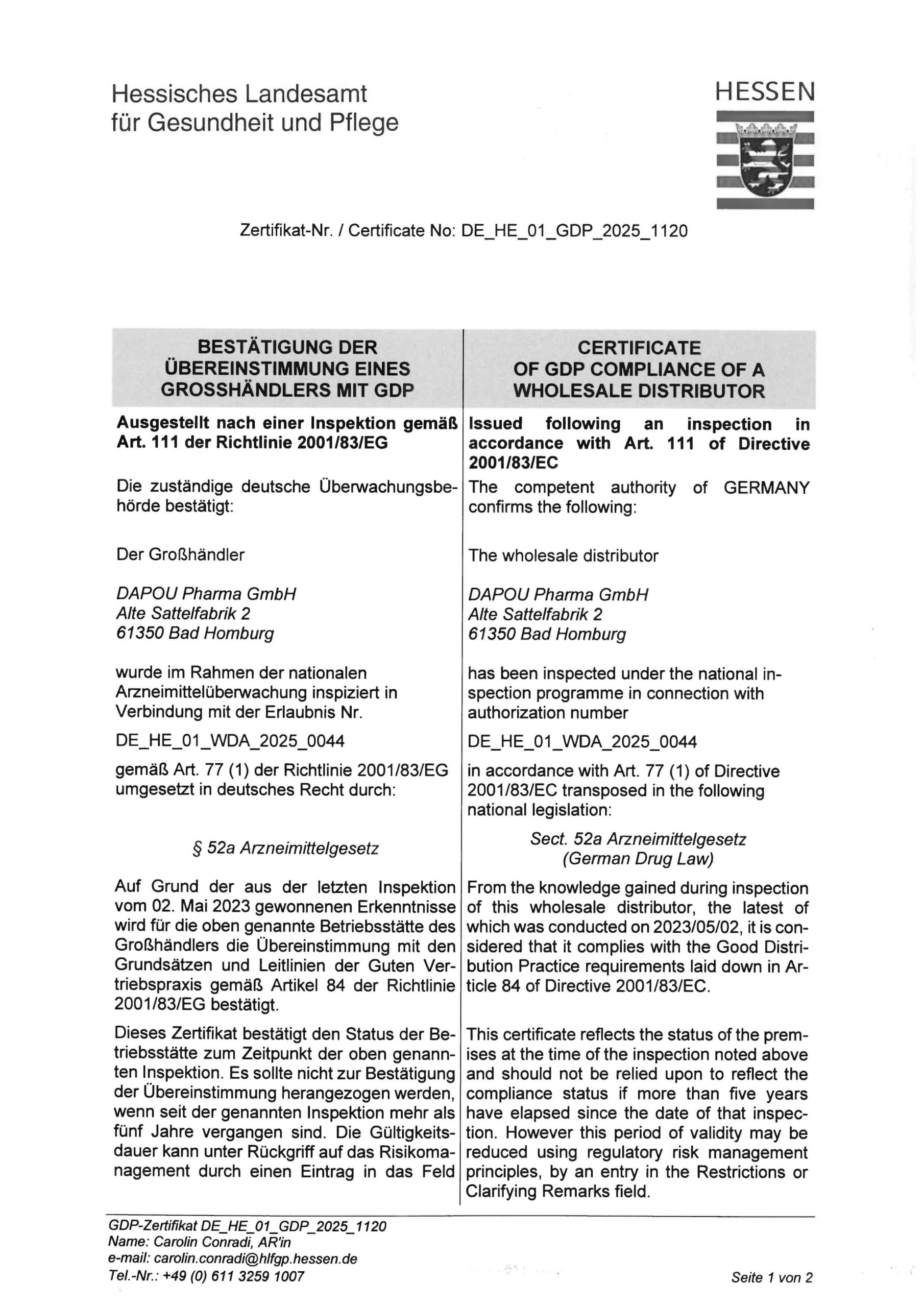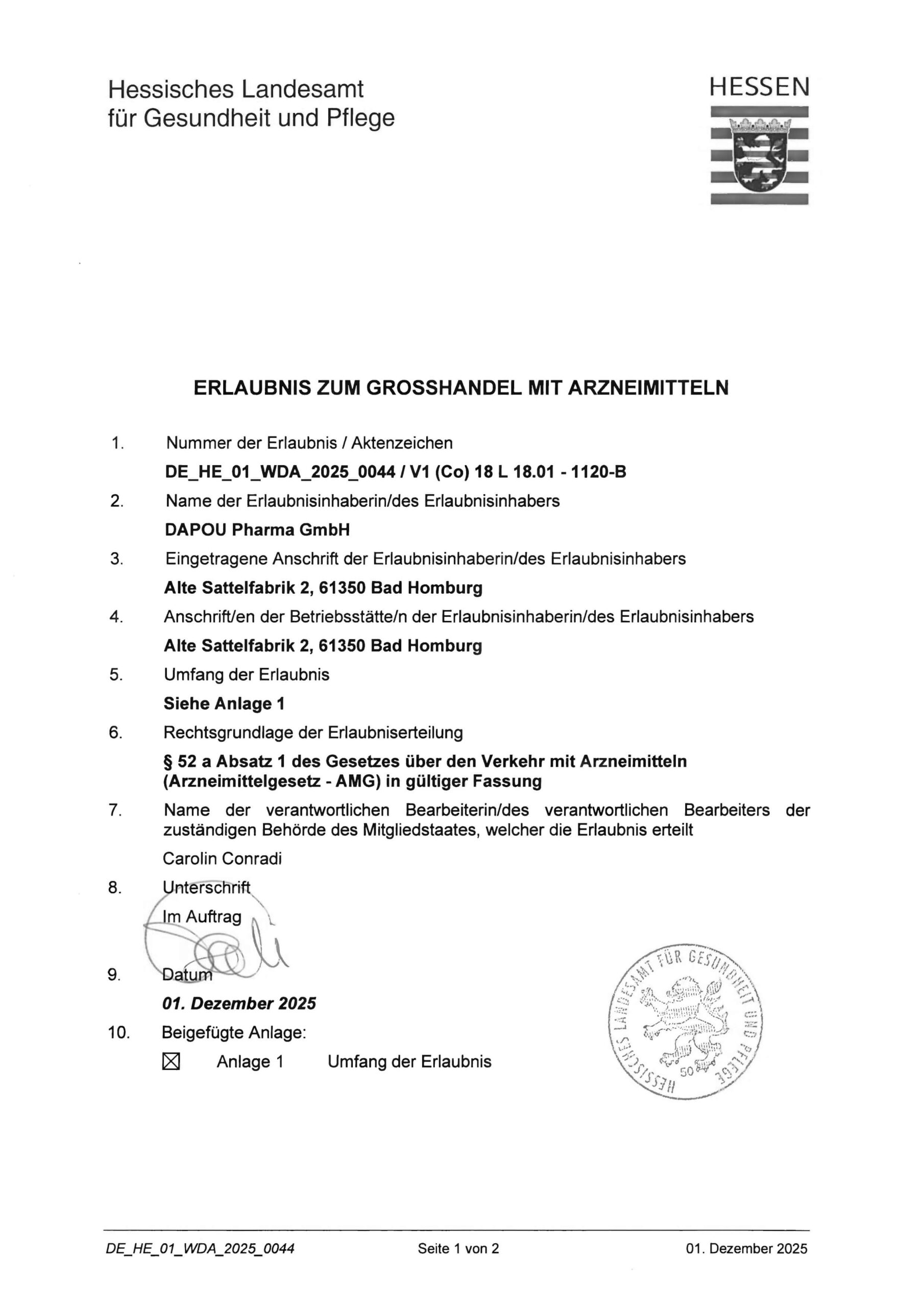 DAPOU Pharma GmbH was founded in October 2010 and works as a pharmaceutical wholesale company in accordance with § 52a of the Medicines Act (AMG) to trade in pharmaceutical products.